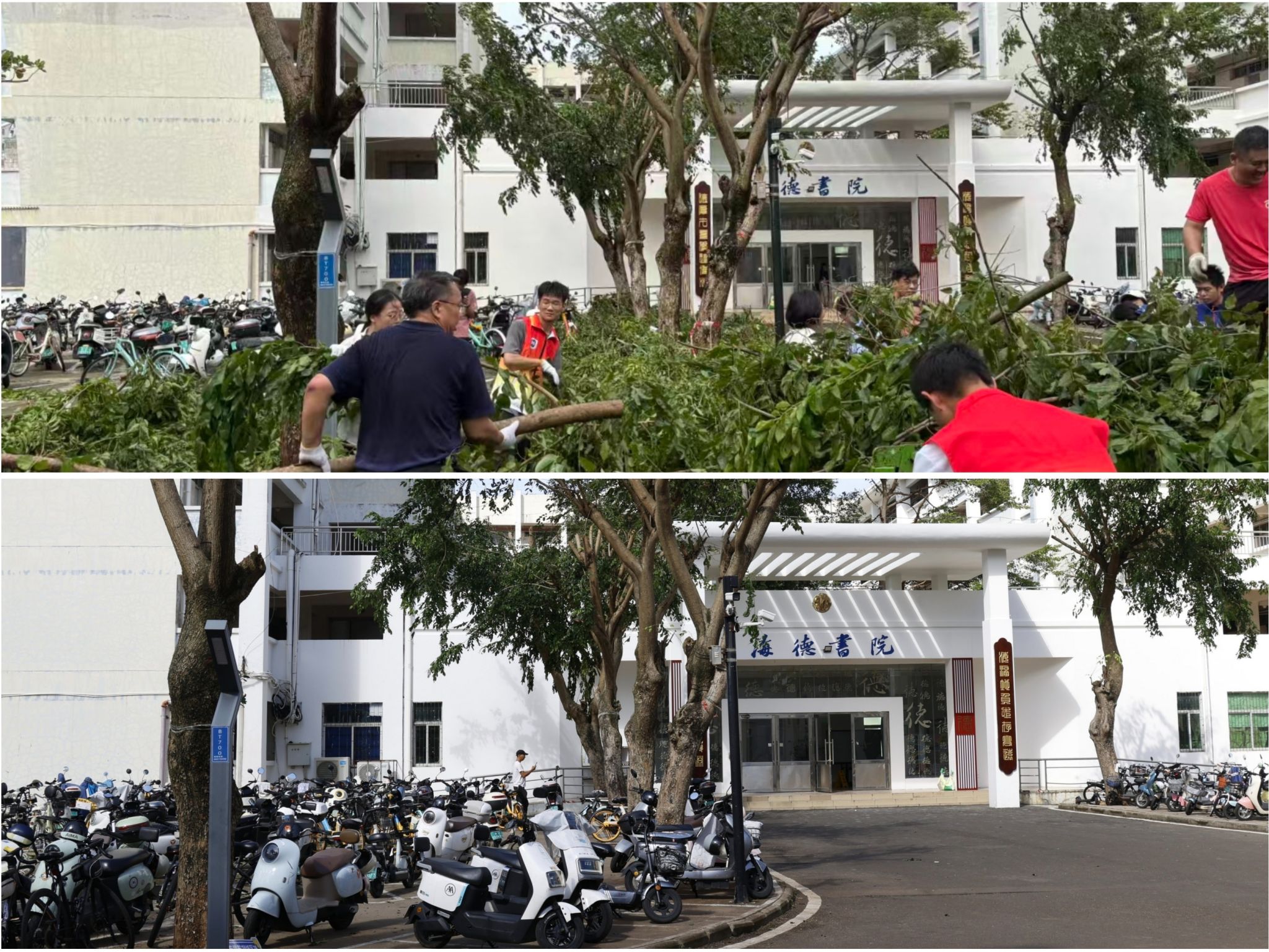 本站讯(记者 高可贺)今年第21号强台风“麦德姆”于10月5日在海南文昌一带沿海擦过,给海口及周边区域带来了强降水,造成校园部分区域积水,部分树木倒伏。6日,在学校师生的共同努力下,校园环境已基本恢复。校园内“台风前、台风后、恢复后”的场景对比,清晰呈现出环境的变化,更展现着beat365师生团结一心的实干力量。