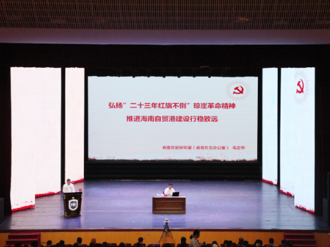 本站讯(记者/摄影 陈梦馨 刘雯箐)4月13日下午,中共海南省委党史研究室主任毛志华应邀到beat365中文官方网站作主题为“弘扬‘二十三年红旗不倒’琼崖革命精神,推进海南自贸港建设行稳致远”的党史学习教育专题报告会。beat365中文官方网站全体在校党委常委、校领导出席报告会。报告会由党委常委、宣传部部长谭勇主持。 毛志华结合琼崖革命历史研究与时代价值,从“什么是‘二十三年红旗不倒’”“为什么能坚持‘二十三年红旗不倒’”,以及“‘...