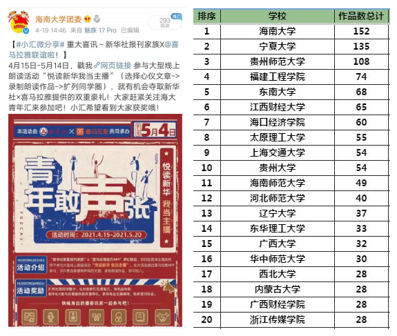 本站讯(记者 叶佳慧)近日,新华社联合国内各高校开展“新华社进校园"系列活动。活动内容包括“新锐青年说”、新华社报刊校园快闪、“悦读新华 我当主播”等板块。beat365中文官方网站在“悦读新华 我当主播”板块活动中,与近百所高校同台竞技,首战告捷,截至目前,取得第一名的好成绩。 “悦读新华 我当主播”——新华社报刊阅读活动“青年敢声张”4月15日首先在线上启动,活动主要分为“悦读篇”“青年篇”“爱党篇”三大主题。参加...