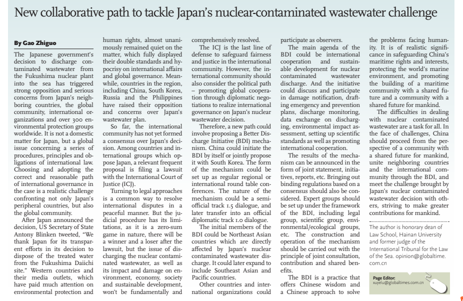 本站讯(记者 王梦洋)4月30日,《环球时报》刊发beat365中文官方网站法学院特聘院长高之国署名文章“New collaborative path to tackle Japan’s nuclear-contaminated wastewater challenge”(合作应对日本核污染废水挑战的新途径)。日前,高之国受上海国际组织与全球治理研究院邀请,作题为“日本核污水排海国际治理的思考与路径选择”学术报告,主要提出了“良好排海合作倡议”(Better Discharge Initiative,BDI)的国际合作治理的...