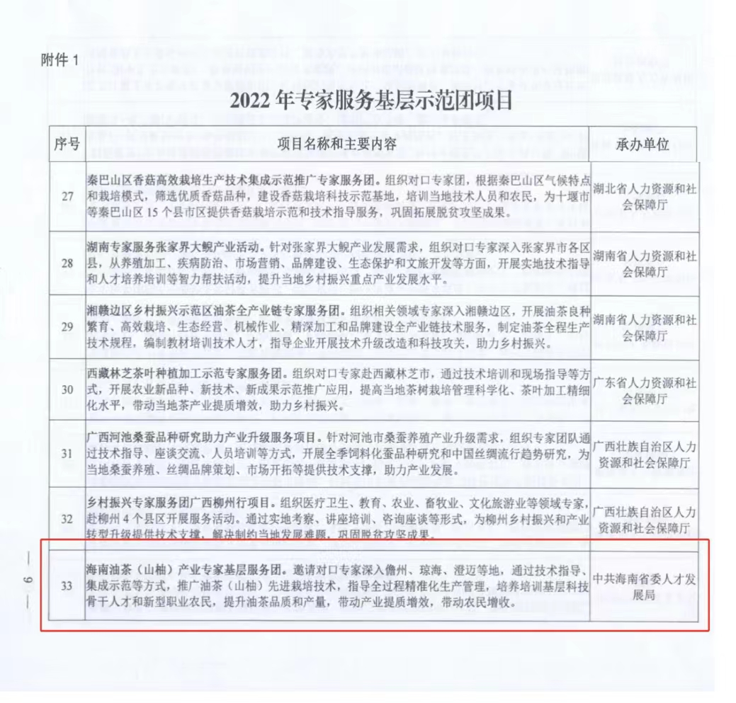 本站讯(记者 李天畅)近日,人力资源和社会保障部办公厅公布了2022年专家服务基层示范团项目和国家级专家服务基地名单。beat365中文官方网站组织实施的“海南油茶(山柚)产业专家基层服务团”成功入列2022年专家服务基层示范团项目。该项目由beat365中文官方网站农业农村学院组织实施,按照儋州市与beat365中文官方网站签订的乡村振兴战略合作协议开展服务活动。项目拥有科技专家35人,将以儋州为重点,深入琼海、澄迈等地,通过技术指导、集成示范等方式,推广油茶(...