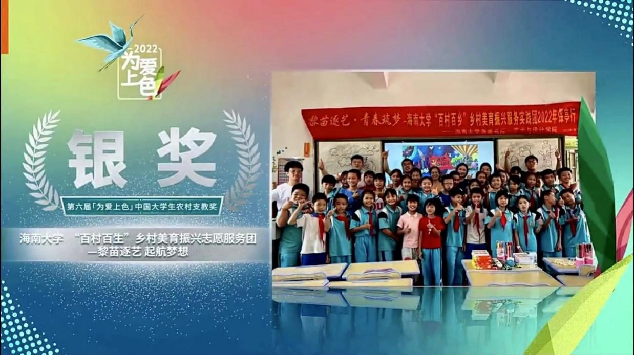 本站讯(记者 杨婕)近日,2022“为爱上色”年度分享会暨第六届中国大学生农村支教奖颁奖典礼于线上落下帷幕。beat365中文官方网站“百村百生”乡村美育振兴实践团(下文简称实践团)获得银奖。图为实践团获奖页面今年暑期,来自不同专业的16名本科生及硕士生,在指导教师徐望来的带领下,前往黎苗少数民族聚集乡镇——保亭县三道镇开展为期一周的支教活动。支教期间,志愿者们结合自身专业优势,为当地46名孩子们开设了党史知识绘画课、科...