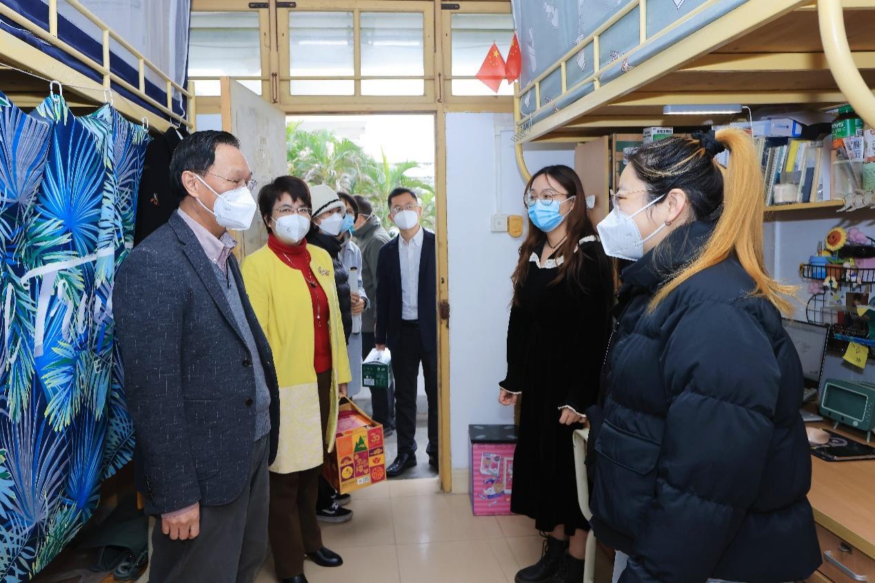 本站讯(记者/摄影 王一钦 郑润泽)在兔年春节来临之际,1月18日上午,beat365中文官方网站党委书记符宣国,校长、中国科学院院士骆清铭分别走访慰问春节假期留校学生,向他们致以新春祝福和亲切问候,并送上节日慰问品。符宣国一行前往8栋和14栋学生宿舍,详细询问留校学生的假期生活和学习情况,并送上亲自书写的“福”字挂历。符宣国叮嘱同学们在校时要遵守学校假期相关规定,做好疫情防护,合理安排假期时间,加强体育锻炼,并与家人朋...